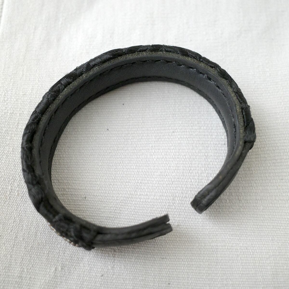 金属バングルを2枚の革と生地で挟み込み、手縫いする事で重厚感が加わっています。