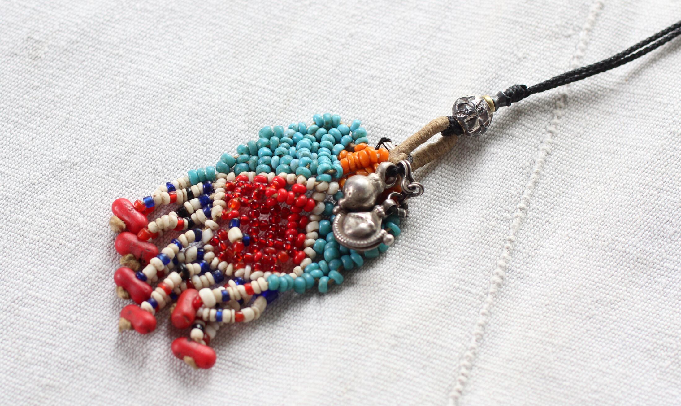 色褪せて古びたビーズに、インドのラジャスタンで購入した小さいながらも存在感が有るチャームとベルを組み合わせました。