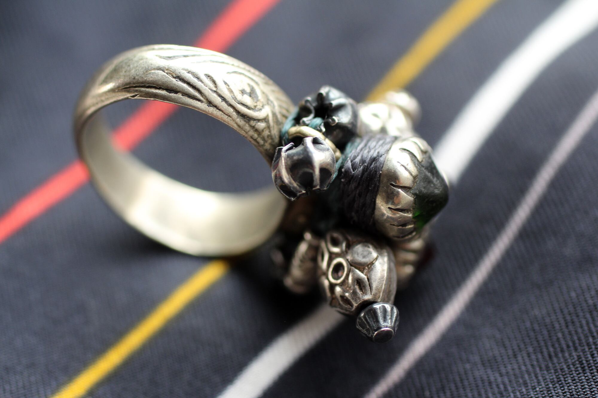 その印象的だったアフガンリングをベースに、世界各国のビーズ、シルバー、オーナメントパーツ、トライバルパーツ等を蝋引き糸で繋ぎ組み合わせて作った指輪です。