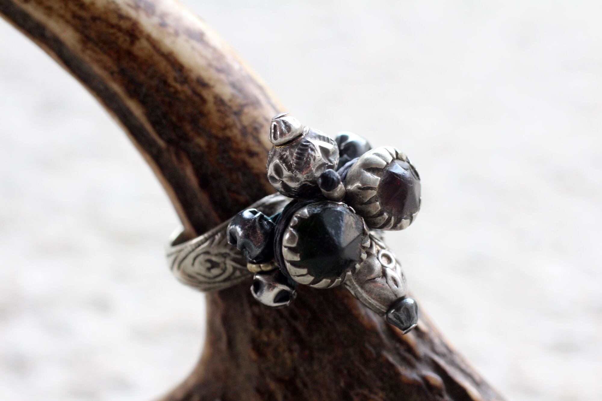 年代は不詳ですが、様々なカラーのガラスがセットされ、リング部分もプレーンな物から彫りが施された物、太さも大きさもバラバラなこのアフガンの指輪を見て、デコレーションしたら面白い指輪になるだろうなと思いました。
