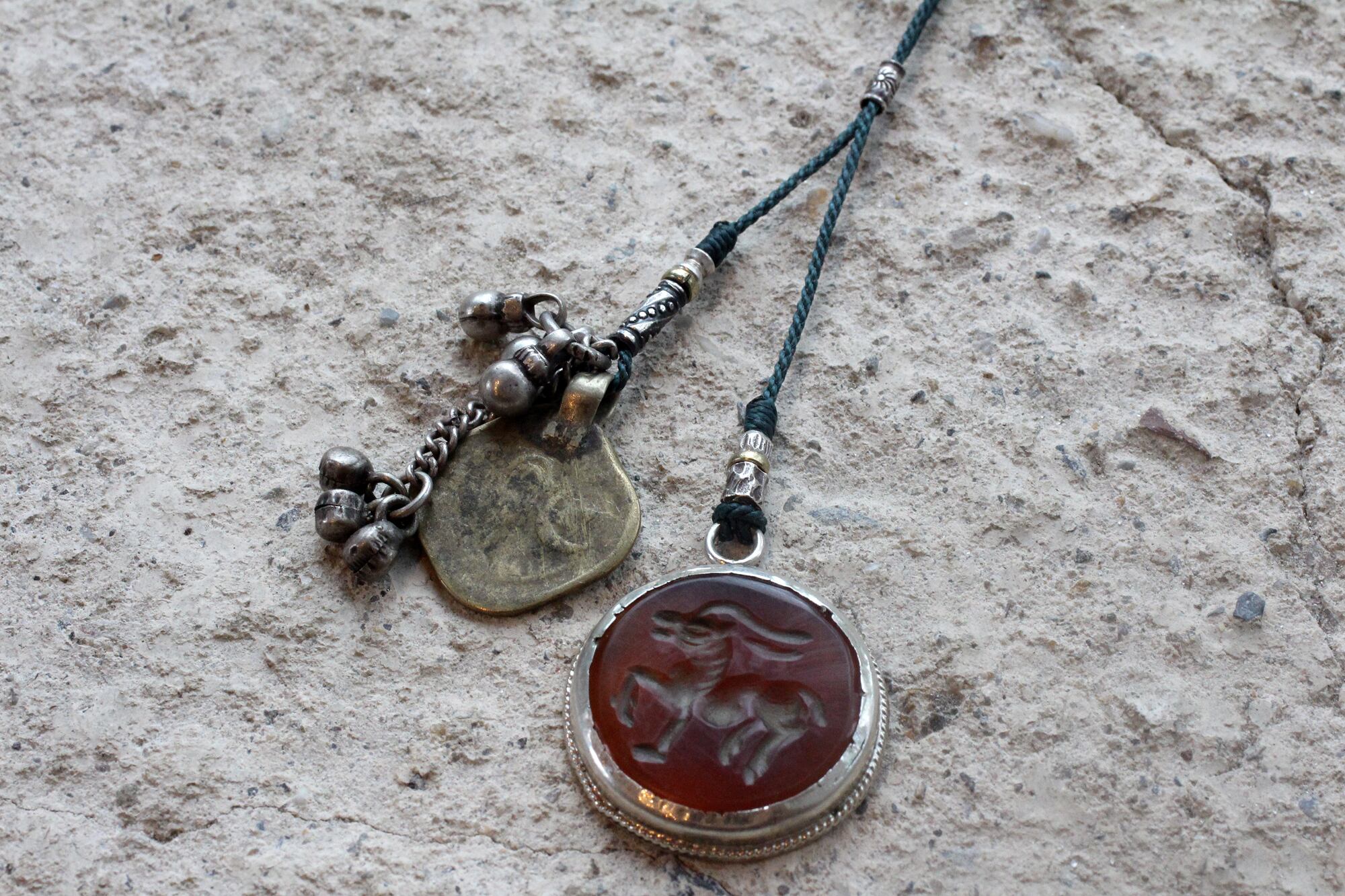 今回はインタリオの中でもモチーフとされる事が多い動物の模様が彫られたアゲートを、シルバー枠でペンダントトップにされていた物を使用しています。生産はパキスタンかアフガニスタンとの事でした。