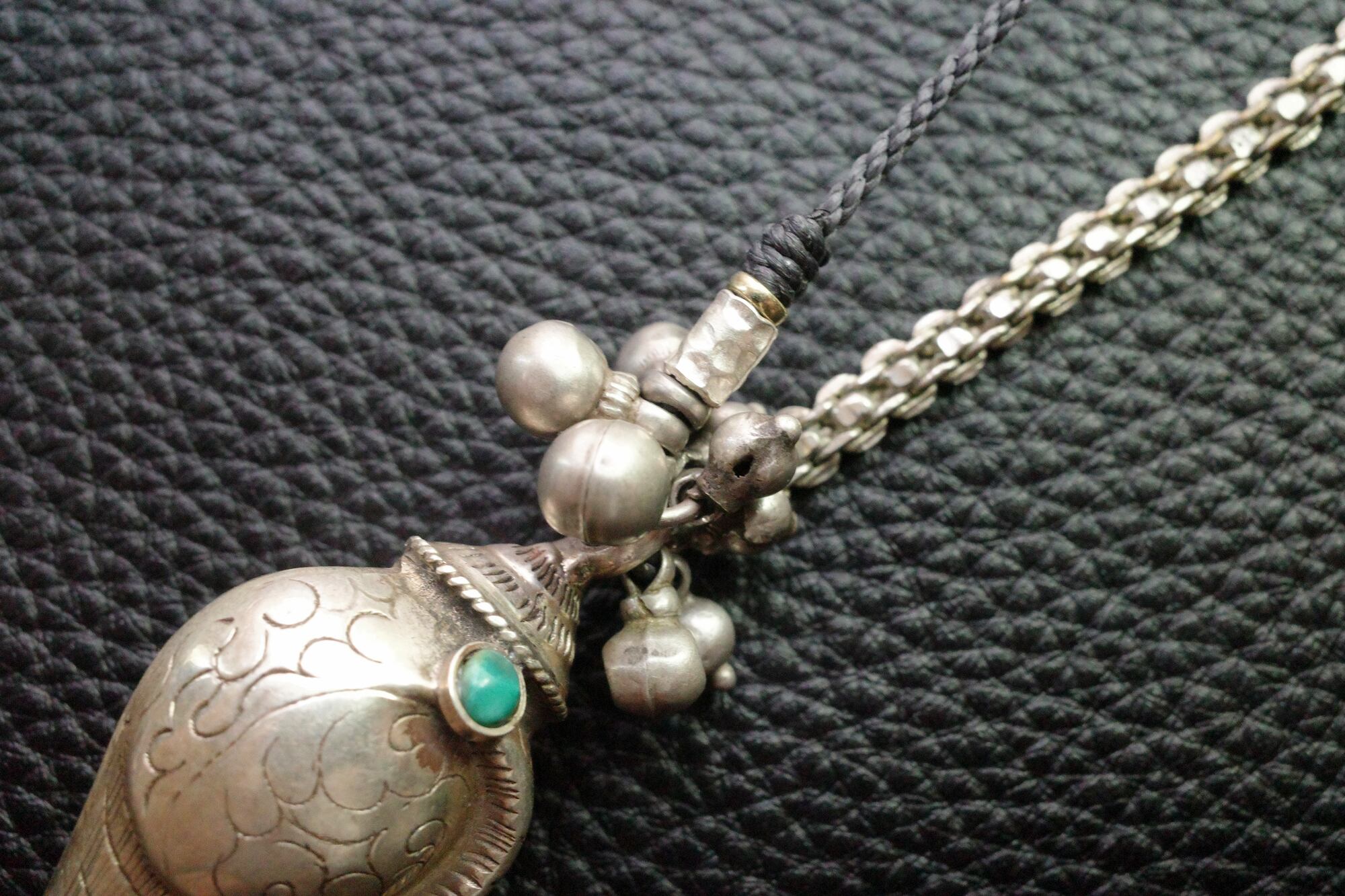 繋げているチェーンは同じく今回の【ムスタン】の旅で購入した【Tharu族】のメタルアンクレットです。こちらにより紐を組み合わせて、随所にインドの砂漠都市【ジャイサルメール】のアンティークディーラーから購入したトライバルシルバーを組み合わせています。